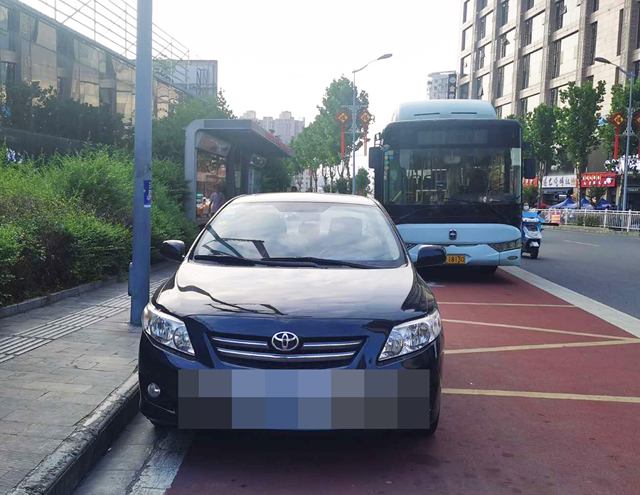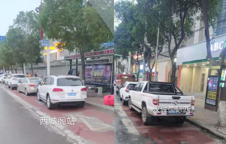在金州廣場南站,十幾輛私家車“整齊劃一”的停在公交車站位置,地面紅色區(qū)域上的公交兩字也被完全覆蓋,從遠處望去,站牌旁坐著幾個人正等待公交車的到來。在興華名城站,一輛私家車停靠在公交車站前,駛來的公交車無法按其規(guī)定進站停車。在西城閣站和漢城國際西站,幾輛私家車甚是“任性”,儼然將公交車站當成了“停車場”,筆者在此駐足十幾分鐘,它們依然“紋絲不動”,有的車上甚至沒有車主。