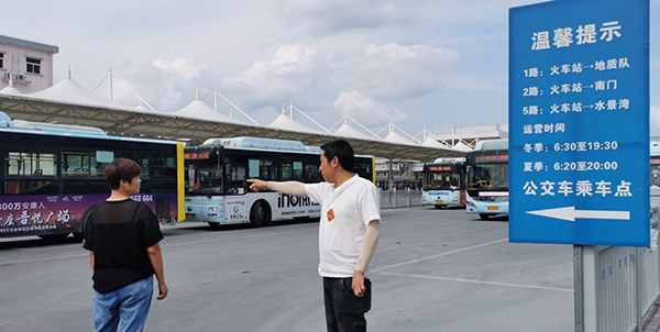 “你就在這等1路車,直達(dá)城東客運站,不用再走到進站路哪兒等車了。”8月11日,在安康火車站公交首末站,市公交公司一車隊副隊長寇邦正告知乘客如何趕往目的地。